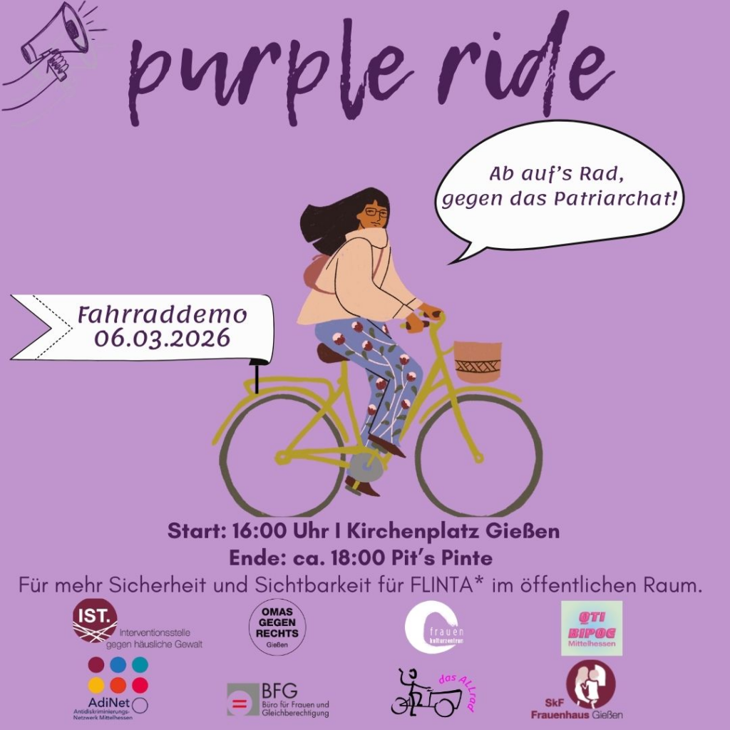 Gemeinsam demonstrieren wir auf dem Rad. Alle FLINTA* (Frauen*, Lesben, Inter, nicht binäre, Trans und Agender Personen) sowie alle Männer, die sich gegen diskriminierende, patriarchale Strukturen stellen wollen, sind eingeladen, sich in der Protestfarbe Lila zu kleiden und gemeinsam mit uns in eine gleichberechtigtere Zukunft zu fahren.